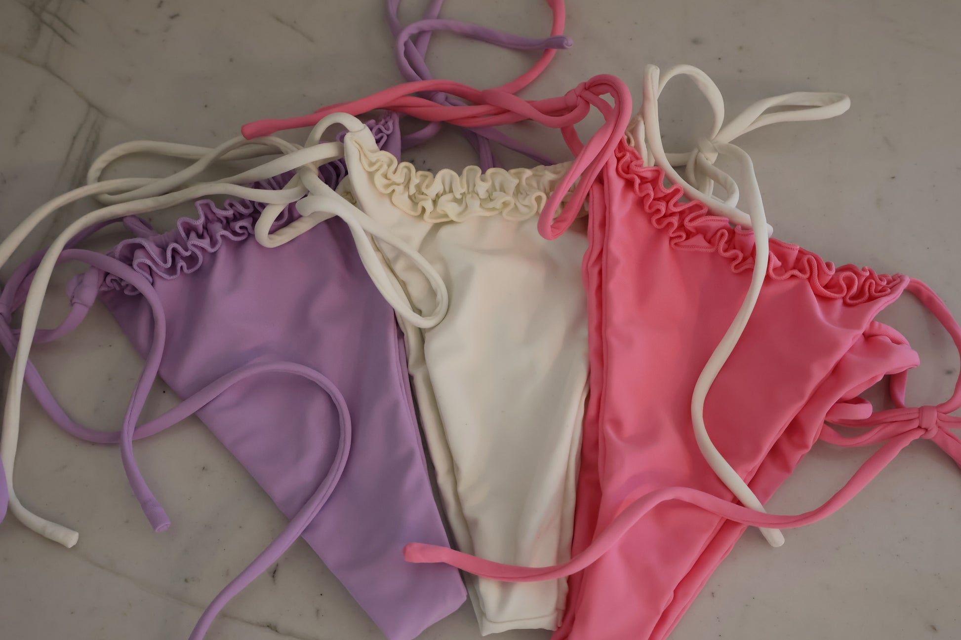 FABRIC DETAILS: FLAMINGO, LAVENDER, IVORY- 78% Recycled Nylon, 22% Elastane